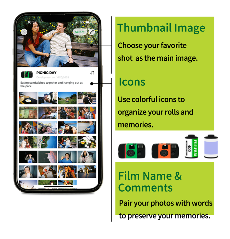 Add film names, words, or customize icons — making it even more fun to look back on your memories.